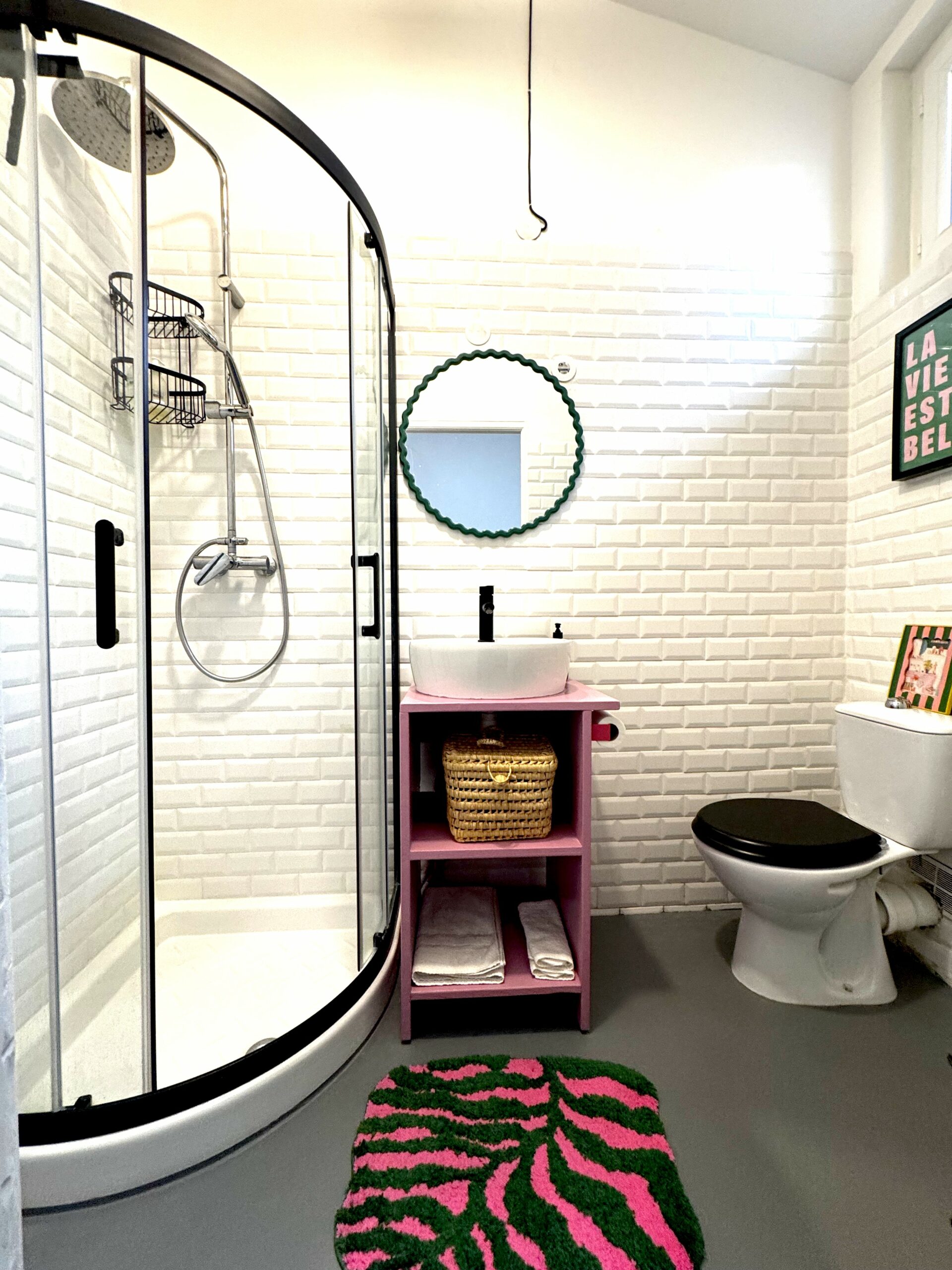 Une Salle de bain moderne avec une belle douche et toutes les commodités nécessaires, avec WC.