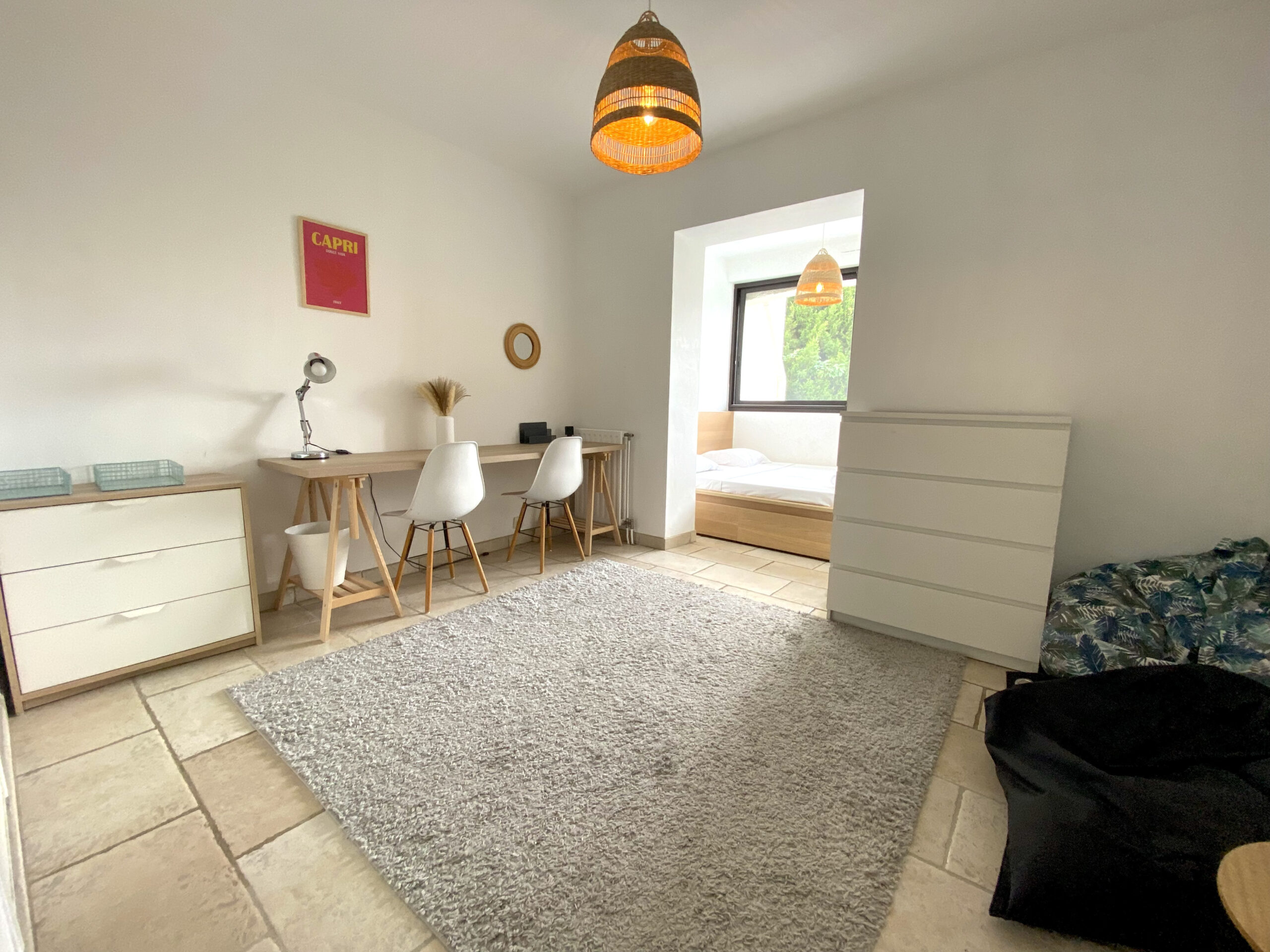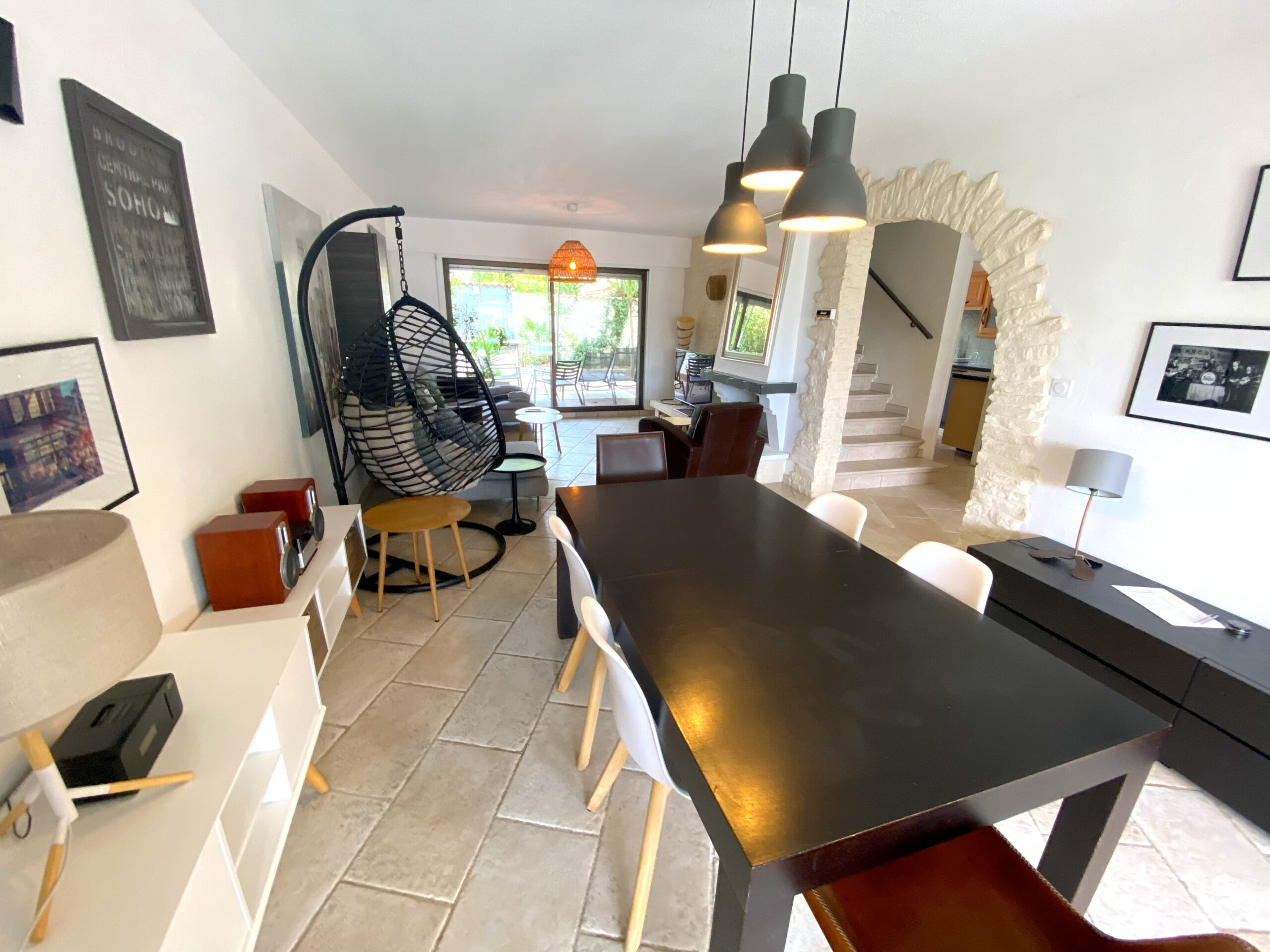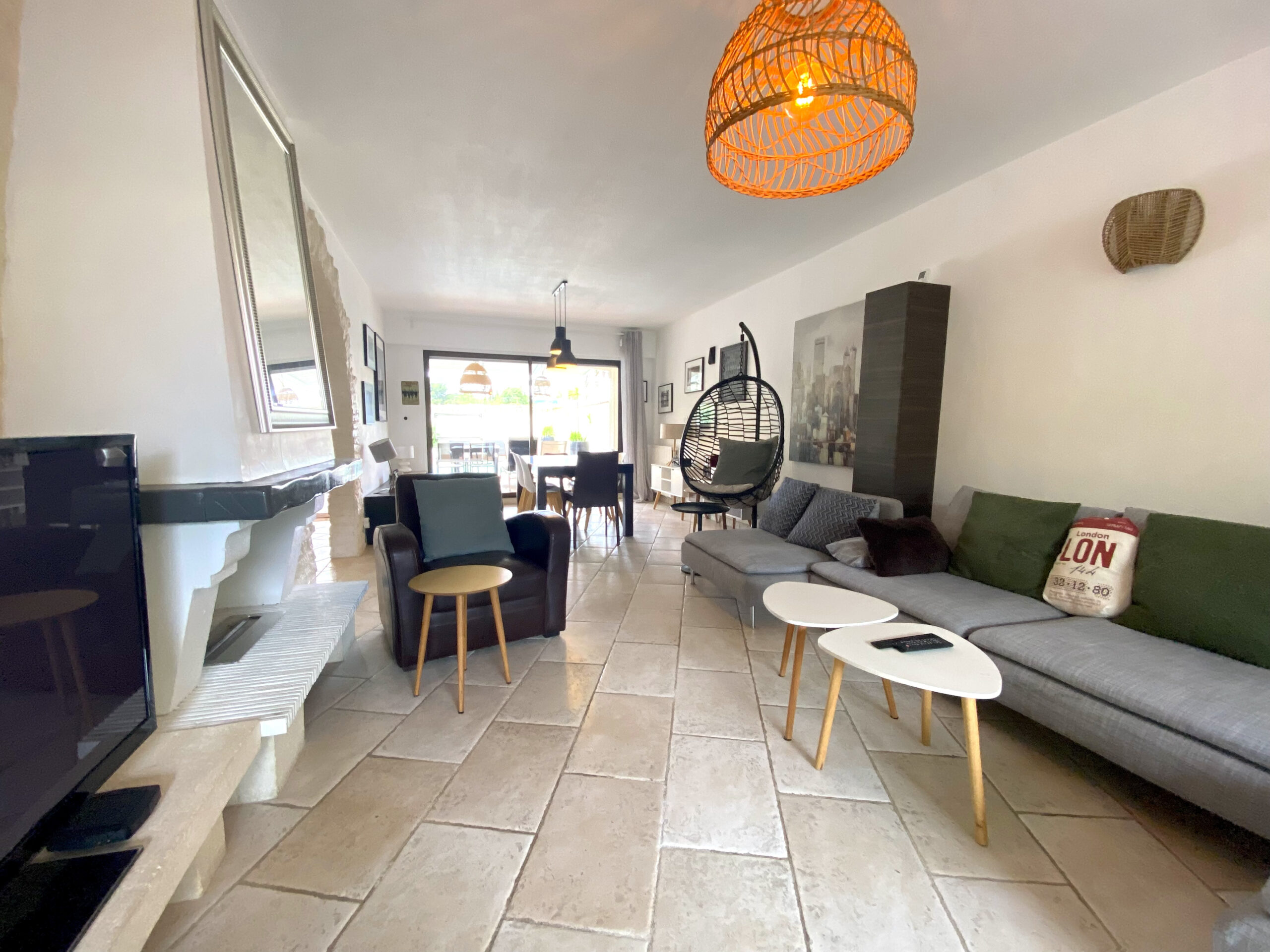 Un vaste séjour lumineux, offrant un espace salon confortable et un espace salle à manger.