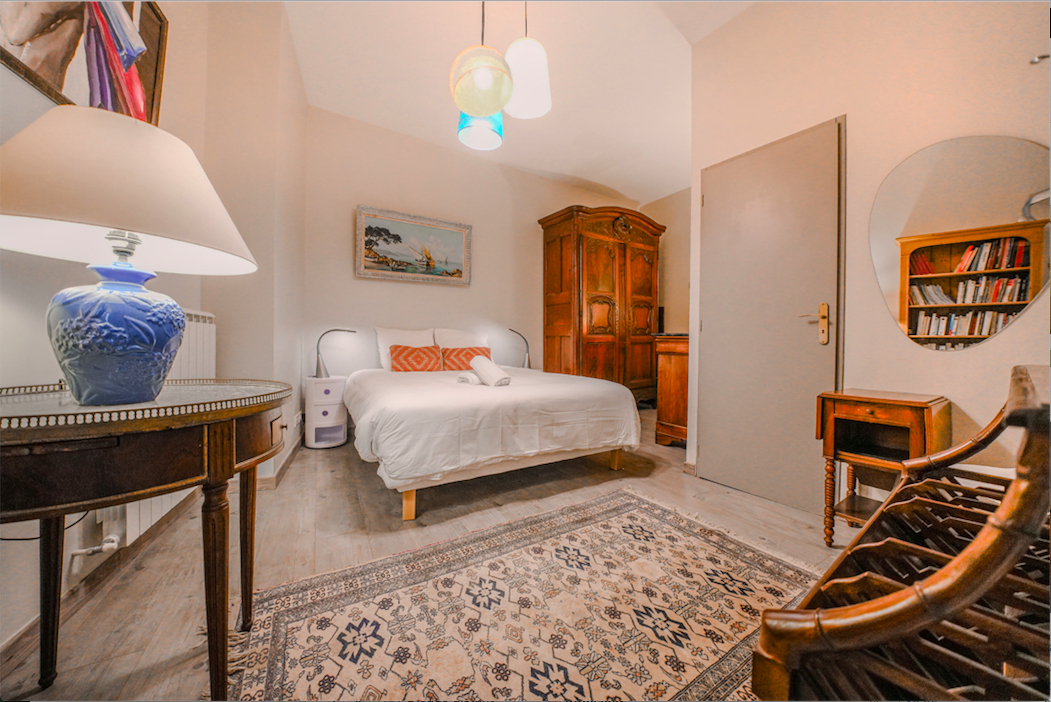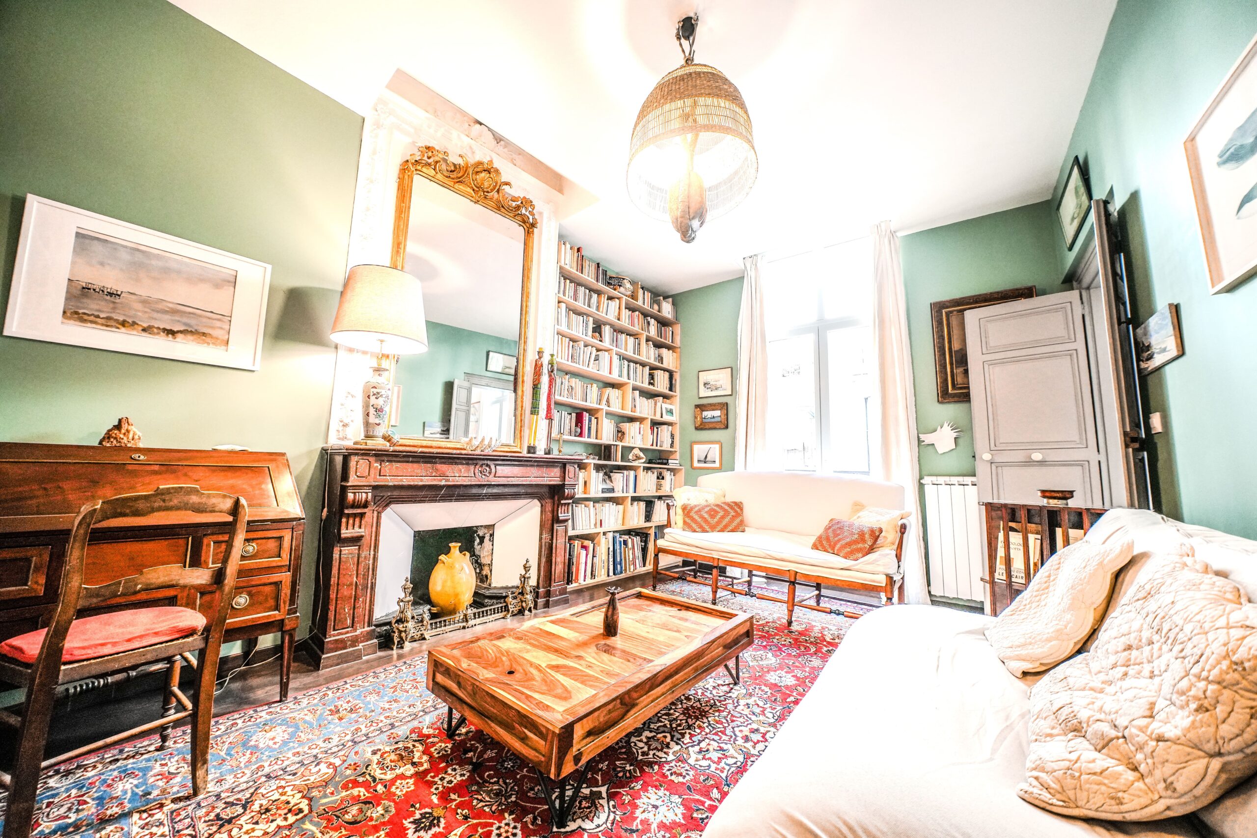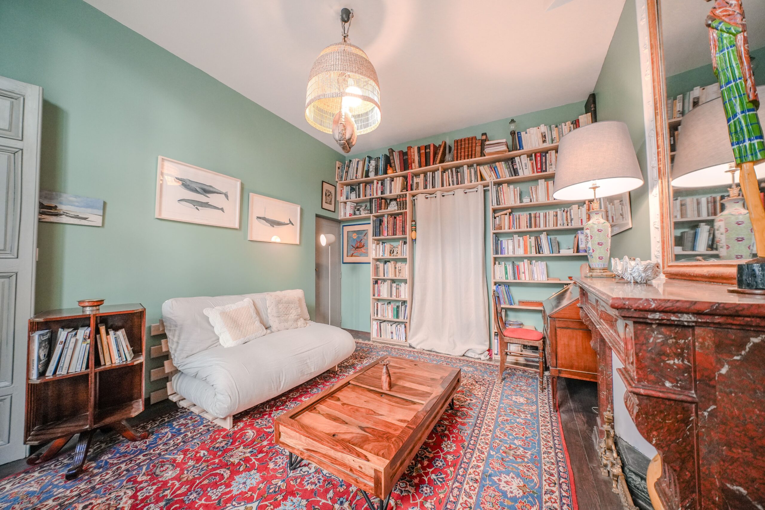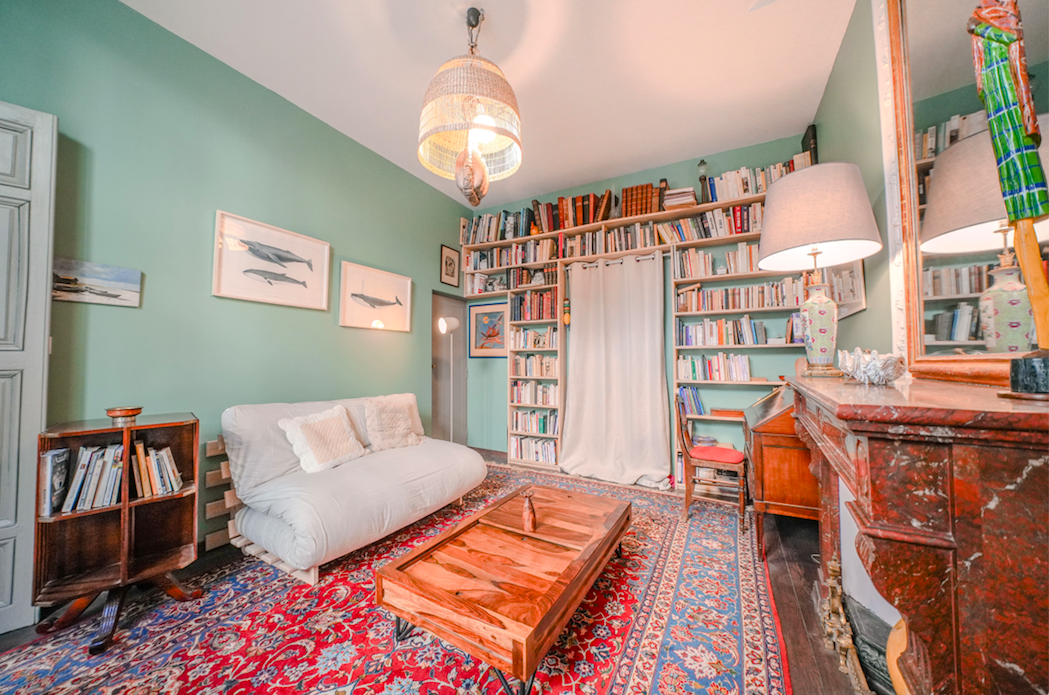 Le salon avec sa grande hauteur sous plafond et sa vieille cheminée est doté d’une grande bibliothèque qui recouvre entièrement les murs, vous pourrez vous installer confortablement dans l’un des deux grands fauteuils qui vous invitent à profiter d’un moment agréable, que ce soit en lisant un livre ou tout simplement en vous relaxant.