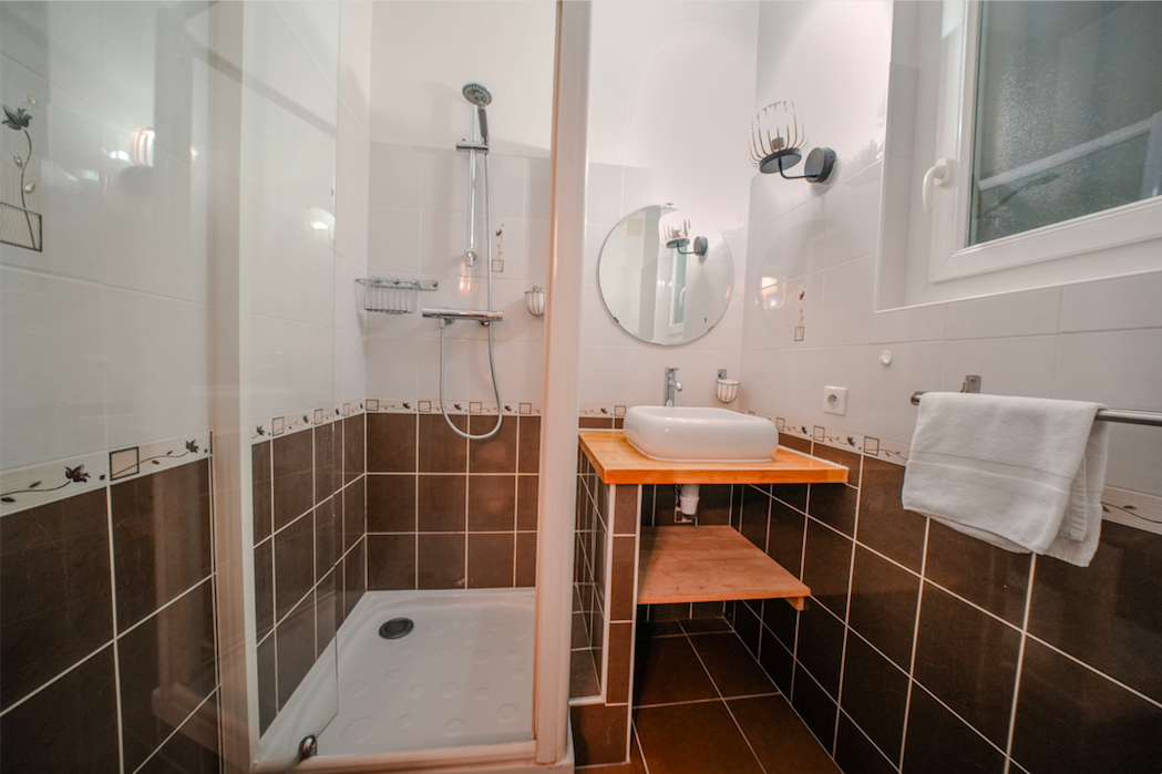 La salle d’eau, attenante à la chambre, propose une douche spacieuse.