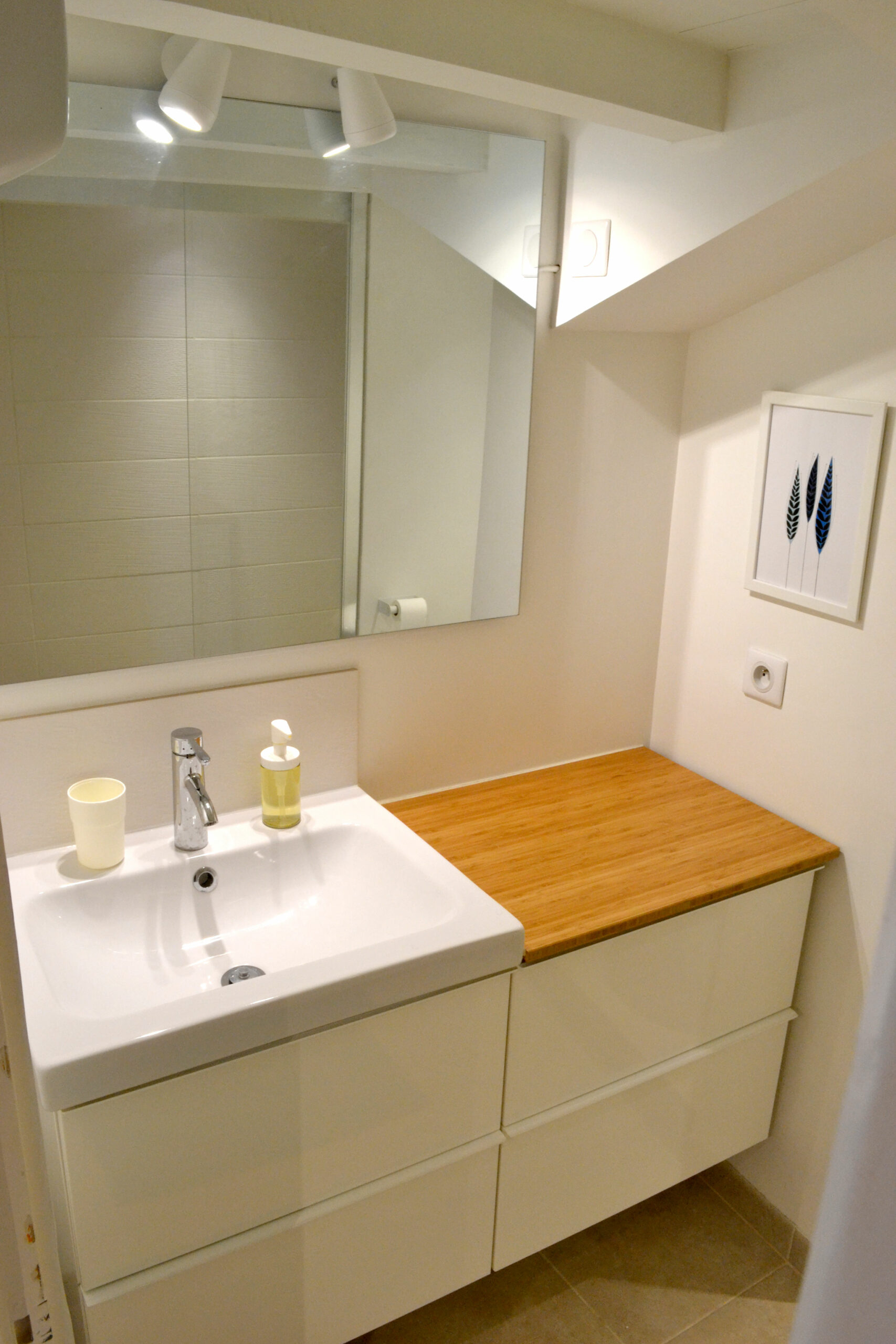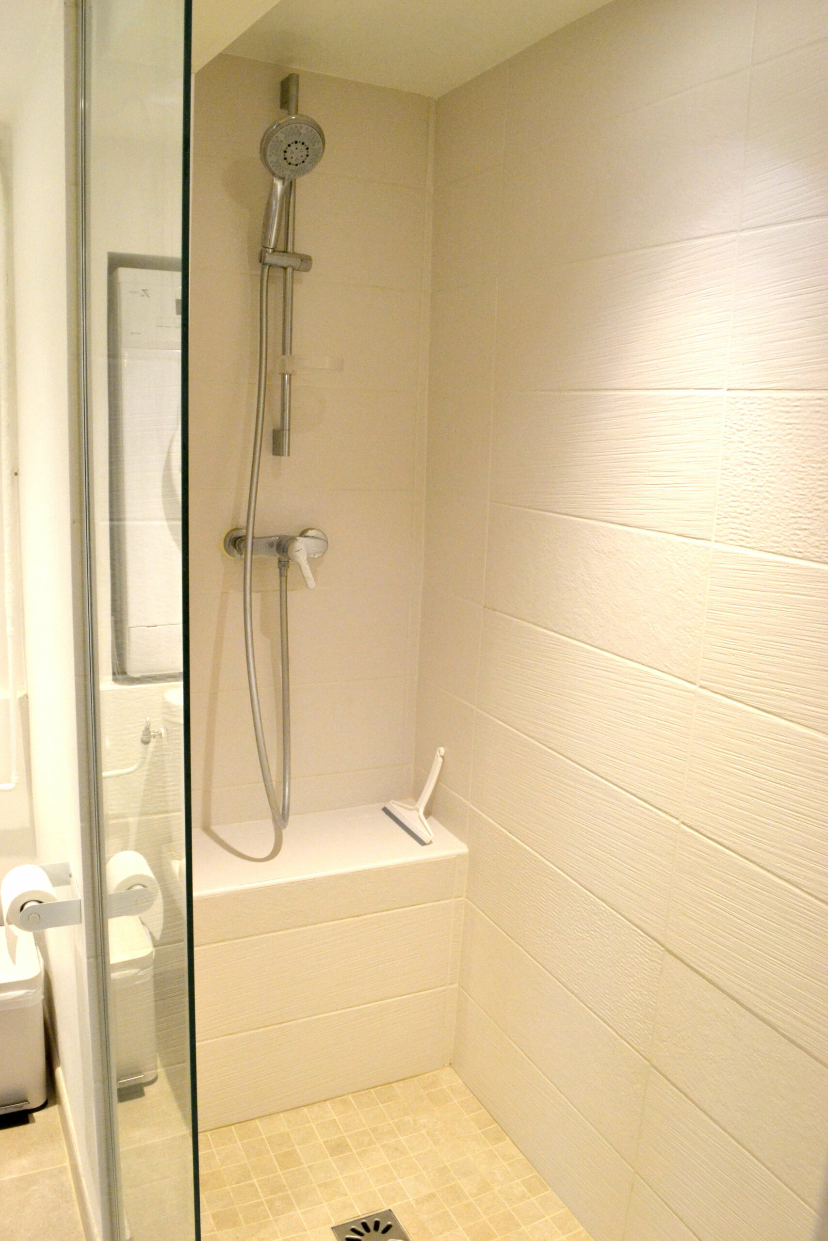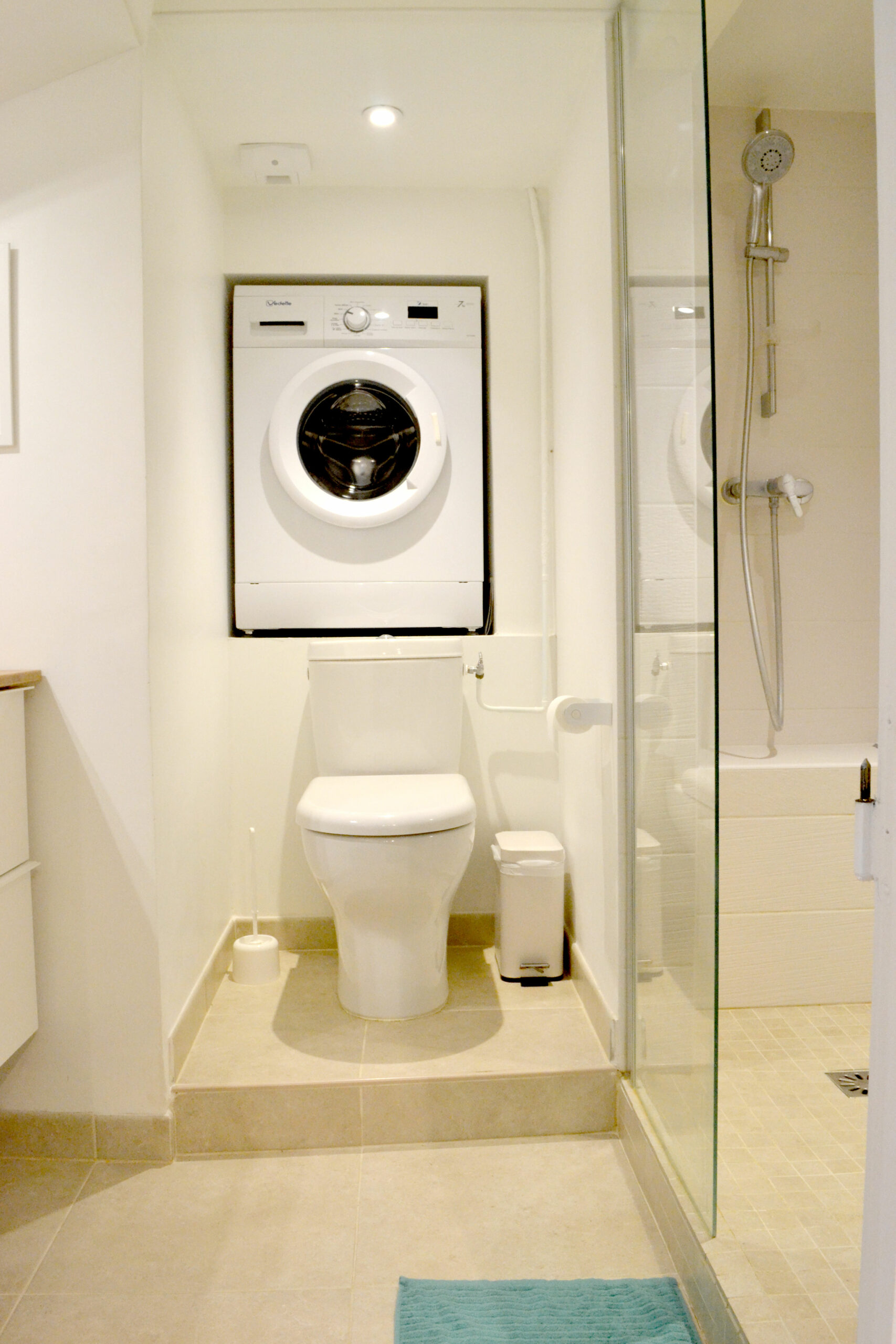 Une Salle de bain moderne avec une belle douche et toutes les commodités nécessaires, avec WC et lave linge.