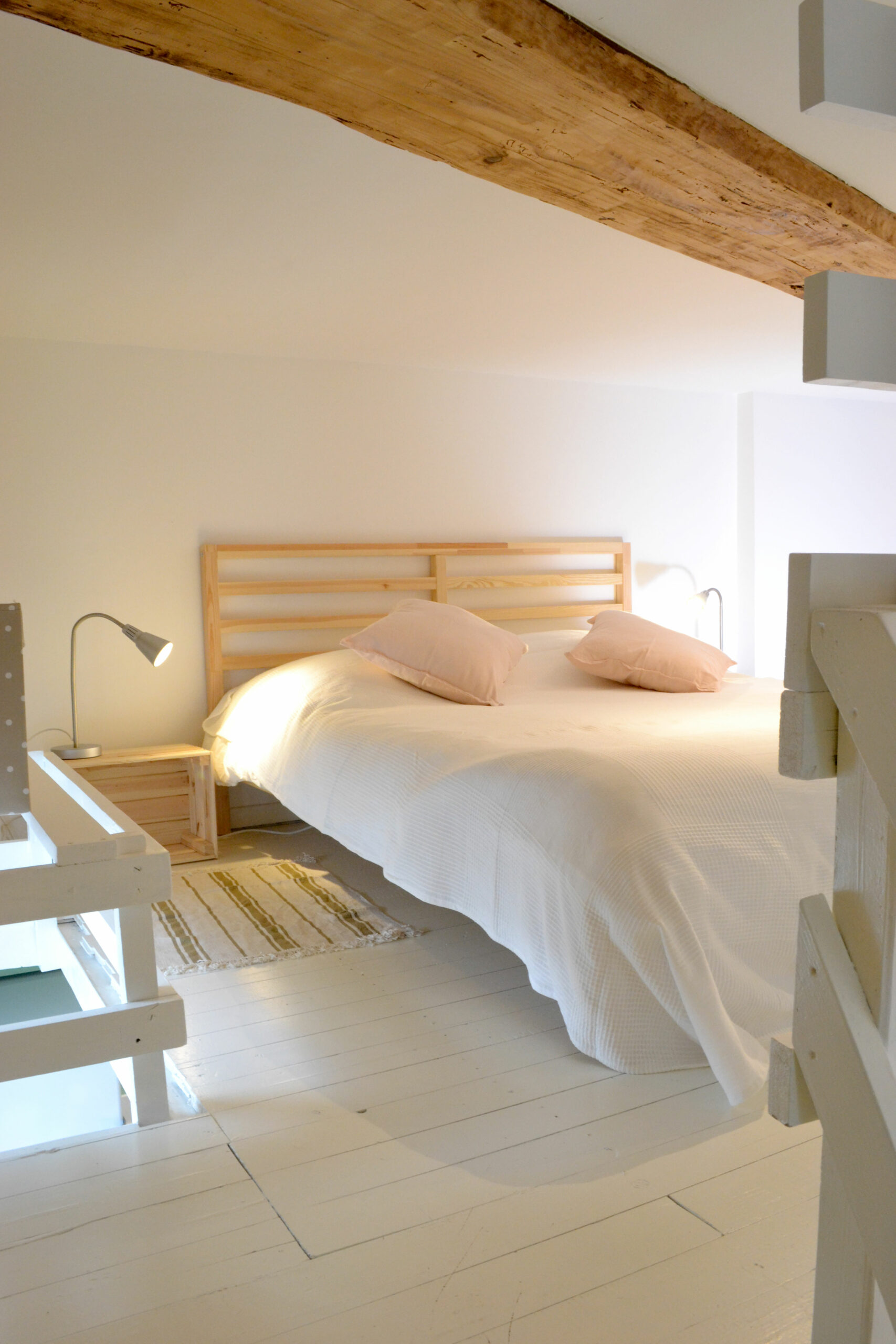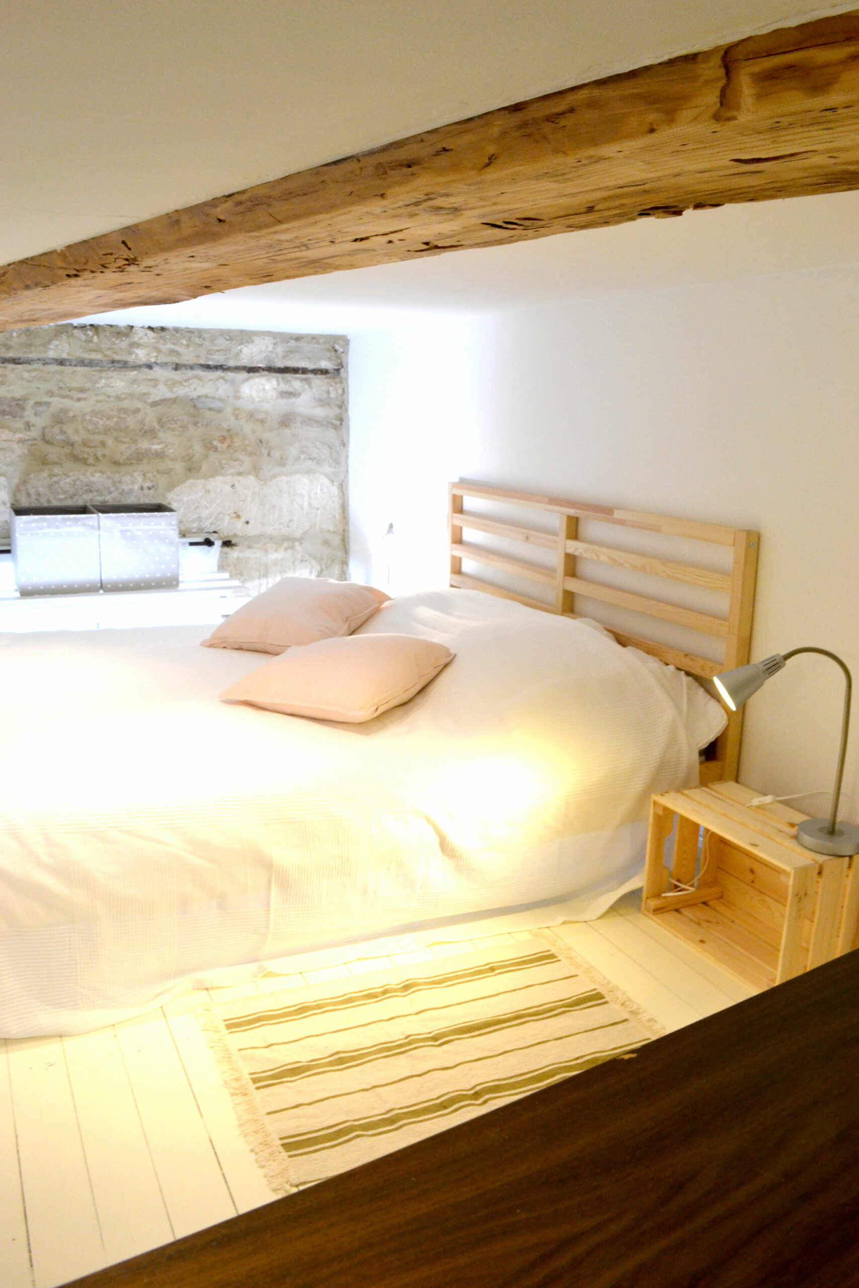 Une chambre mezzanine charmante avec un lit douillet en 140. Veuillez noter que la mezzanine est basse sous plafond (environ 1m50).