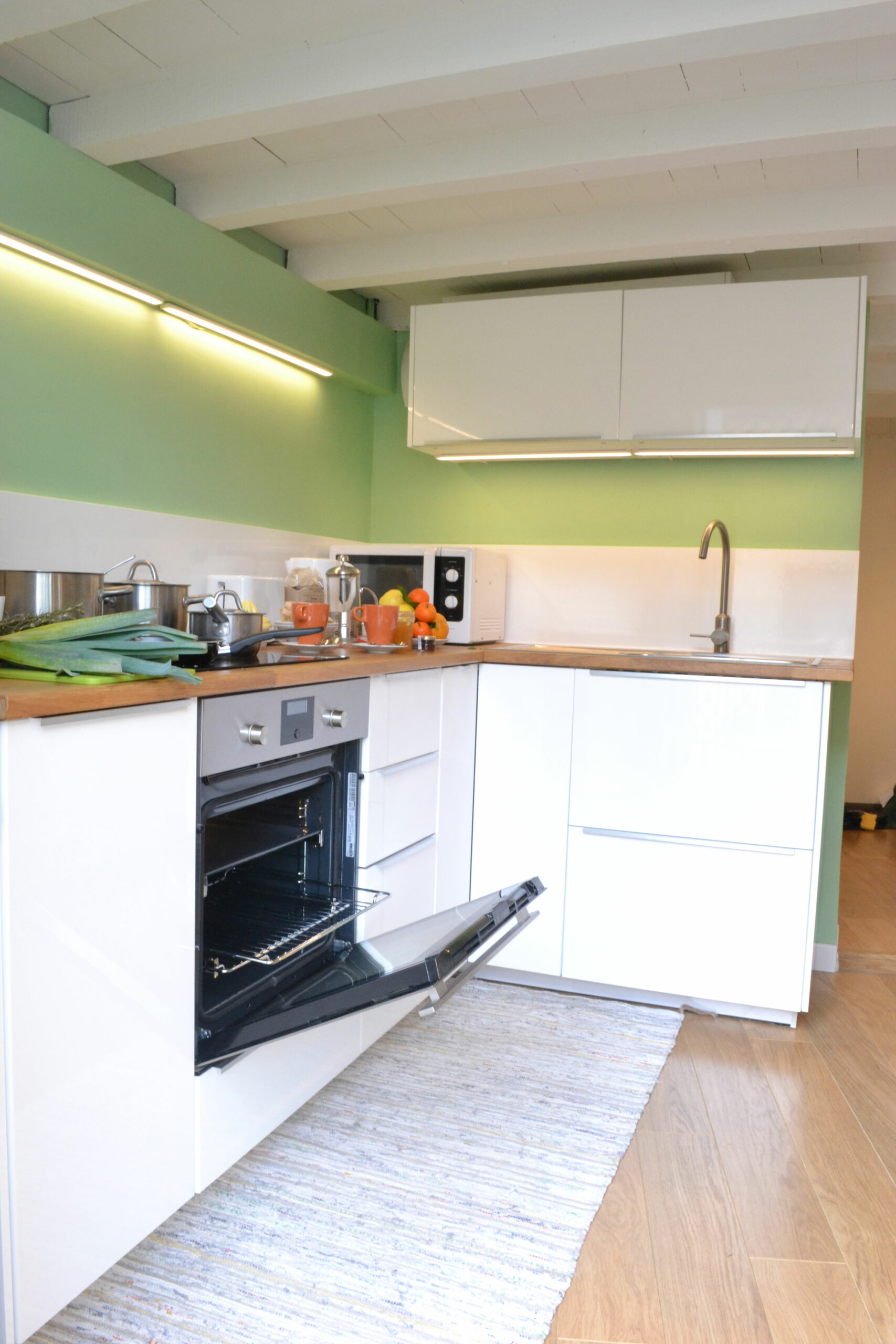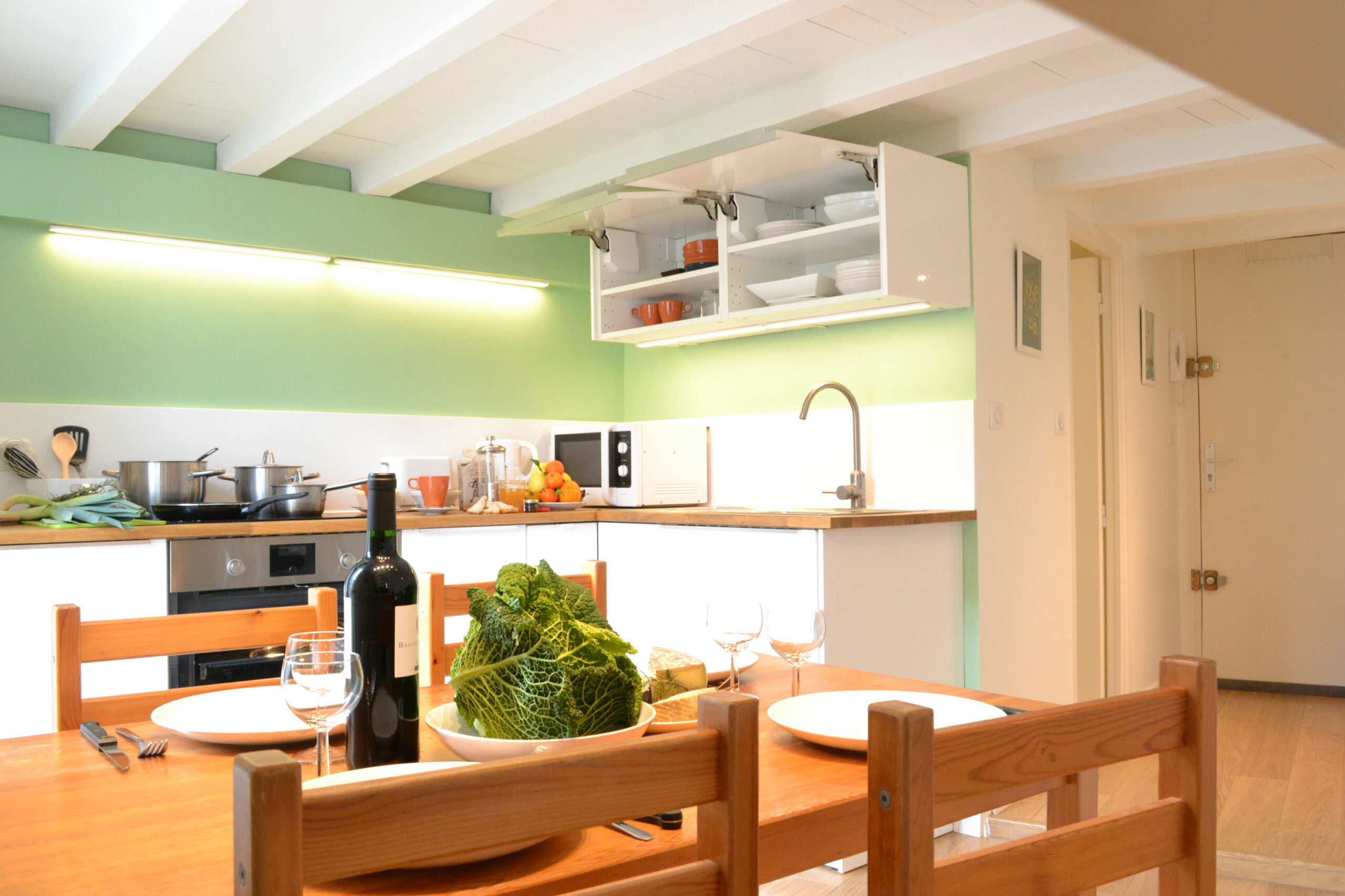Une grande pièce ouverte avec cuisine entièrement équipée pour vos repas, une belle table à à manger et un coin salon accueillant, parfait pour se détendre.