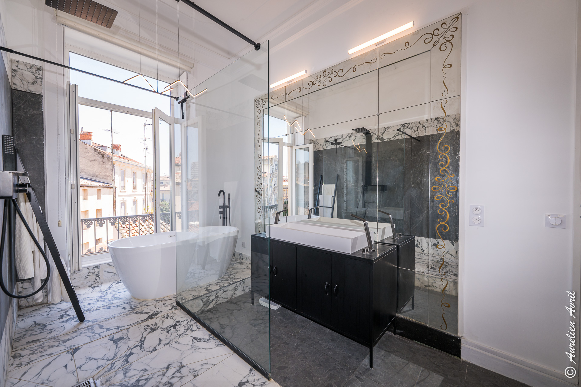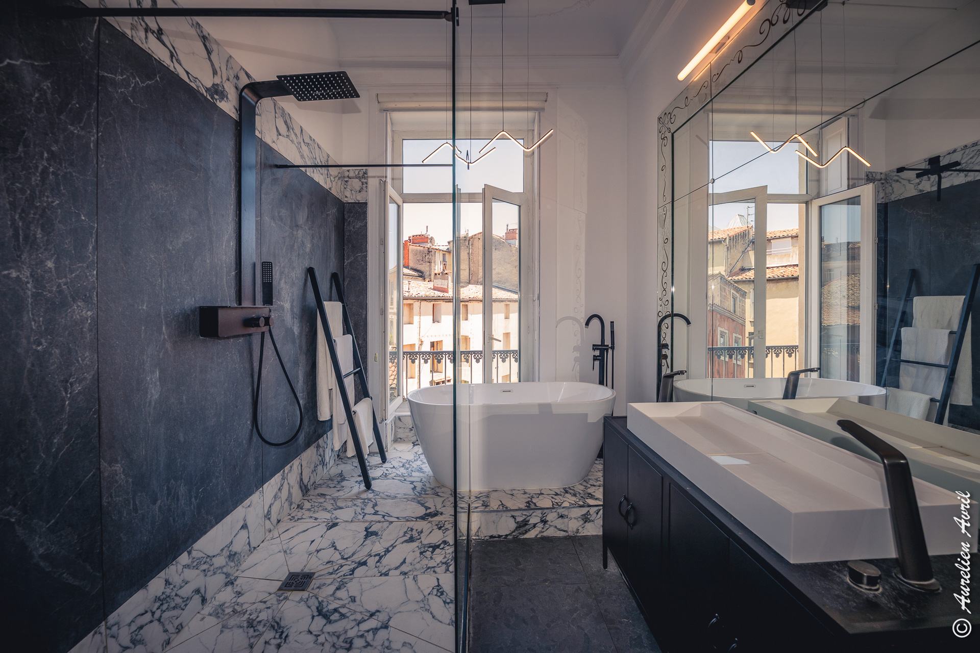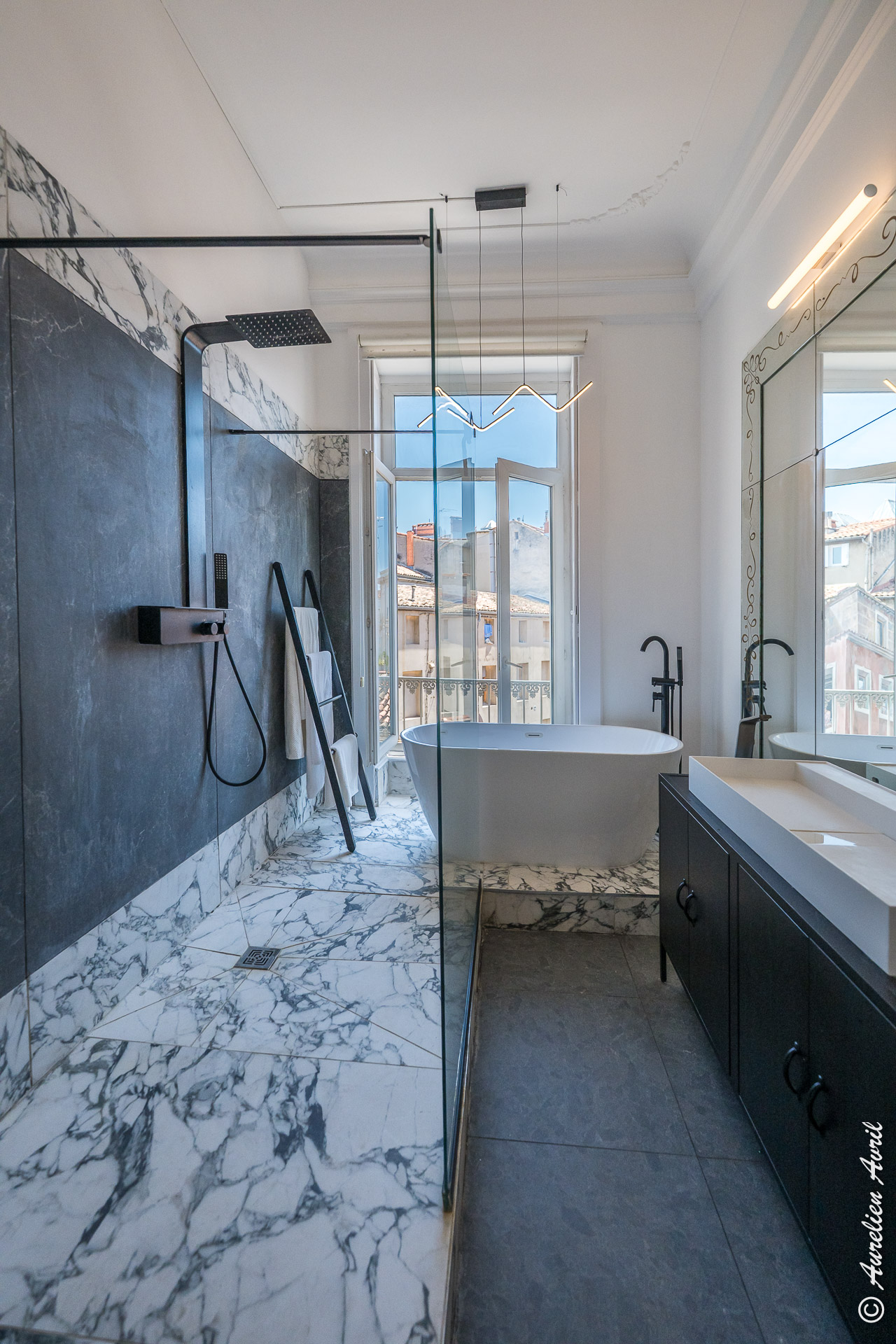 Une salle de bain au ligne épurée, tout en marbre et ardoise, donne accès à une spacieuse douche a l’italienne et à une baignoire posée pour un agréable moment de détente.