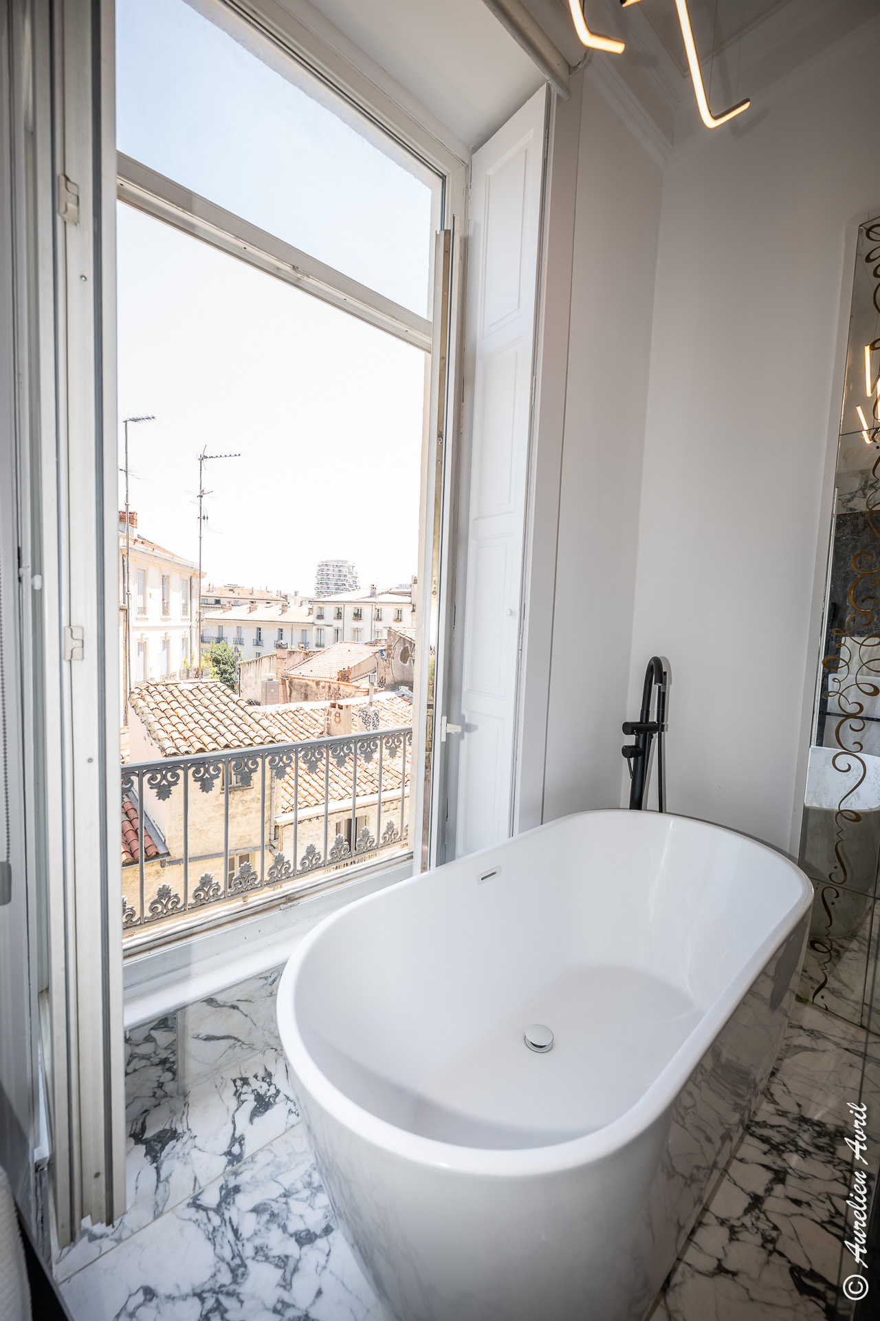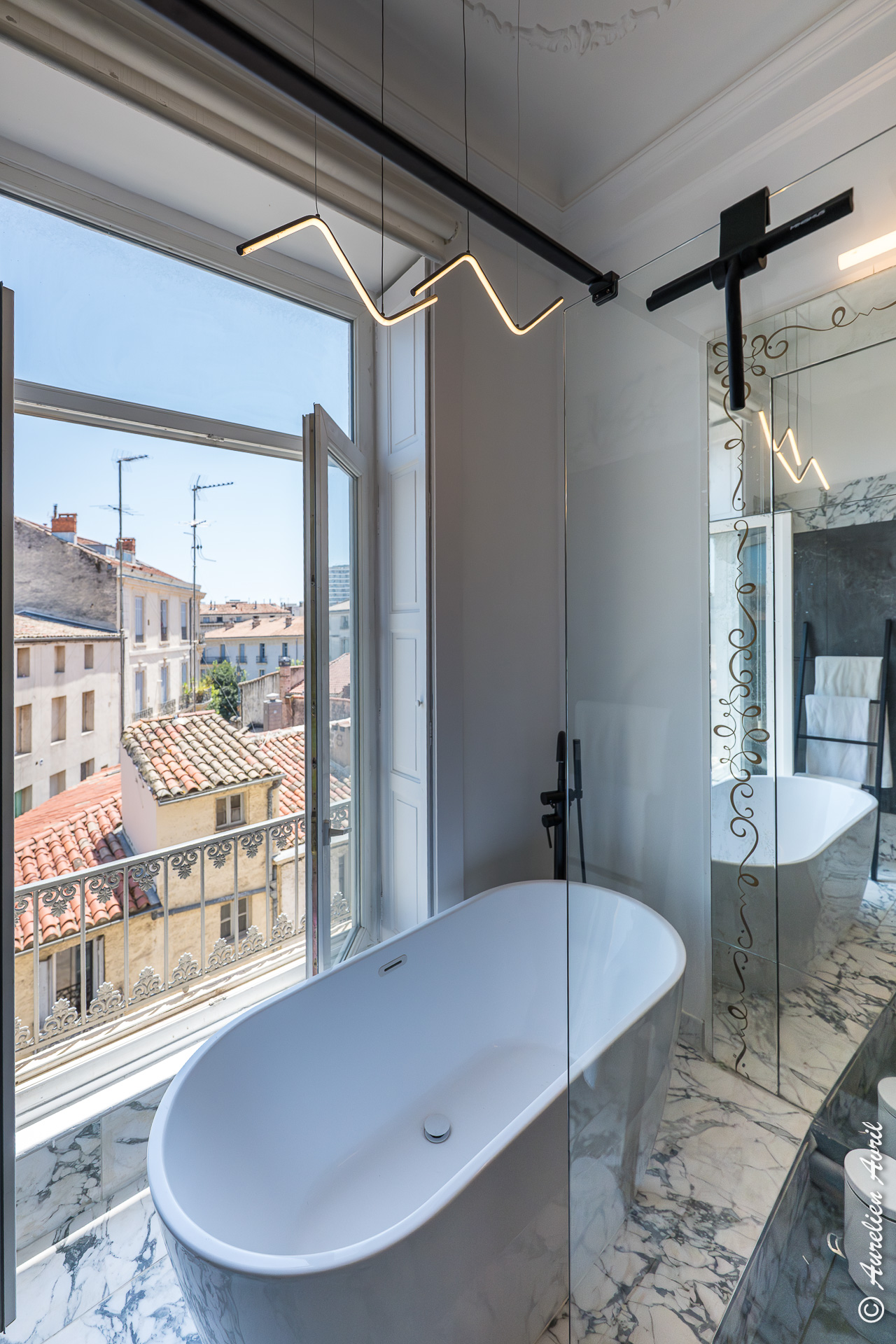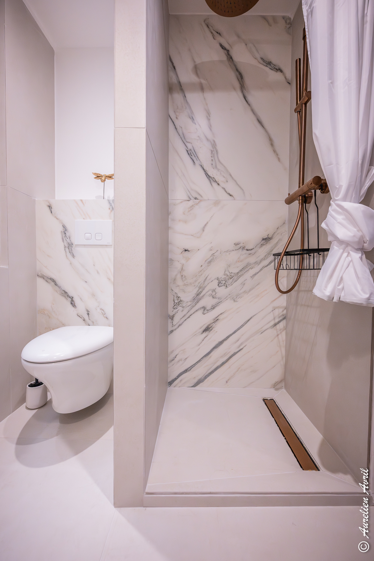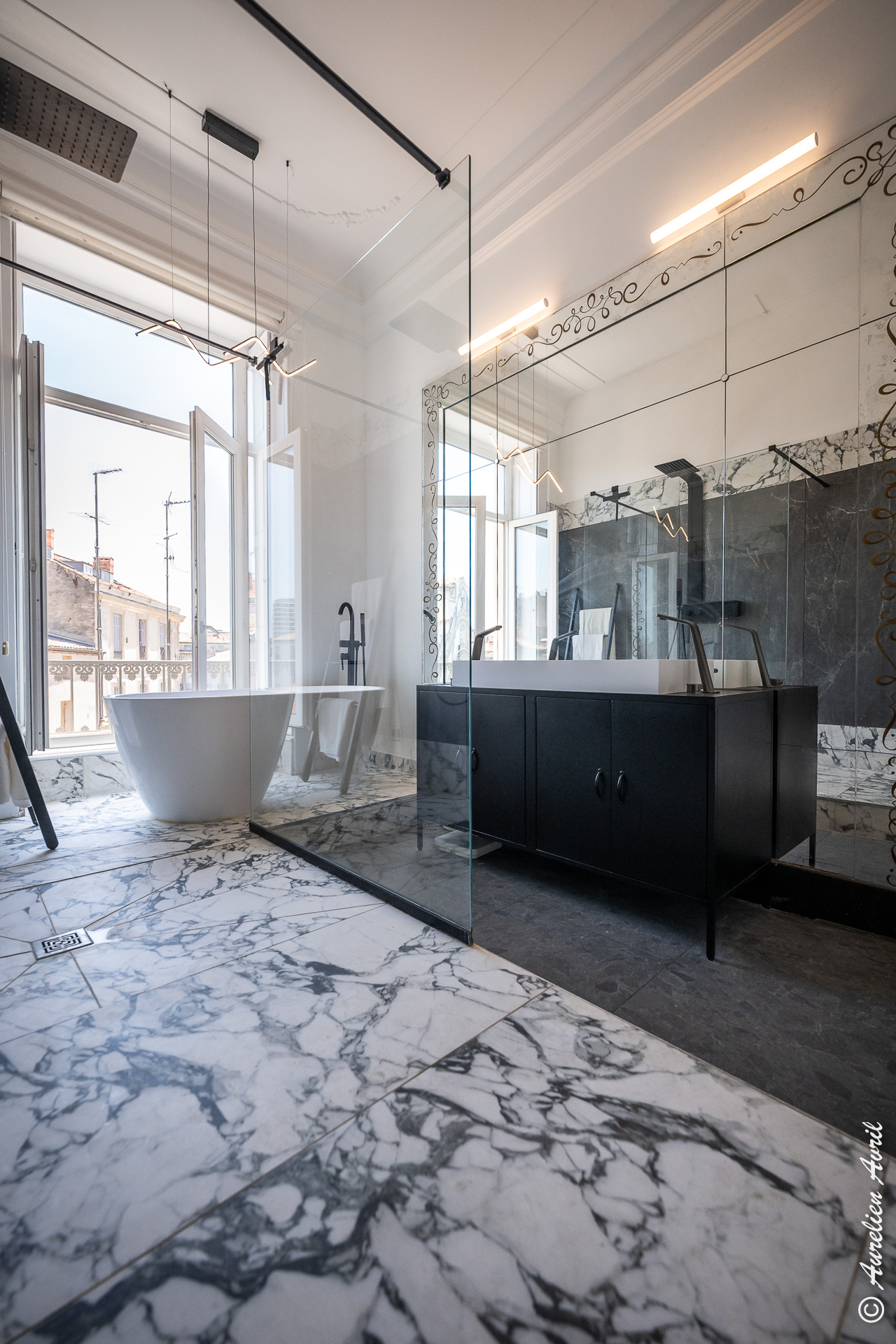 Une salle de bain au ligne épurée, tout en marbre et ardoise, donne accès à une spacieuse douche a l’italienne et à une baignoire posée pour un agréable moment de détente.
