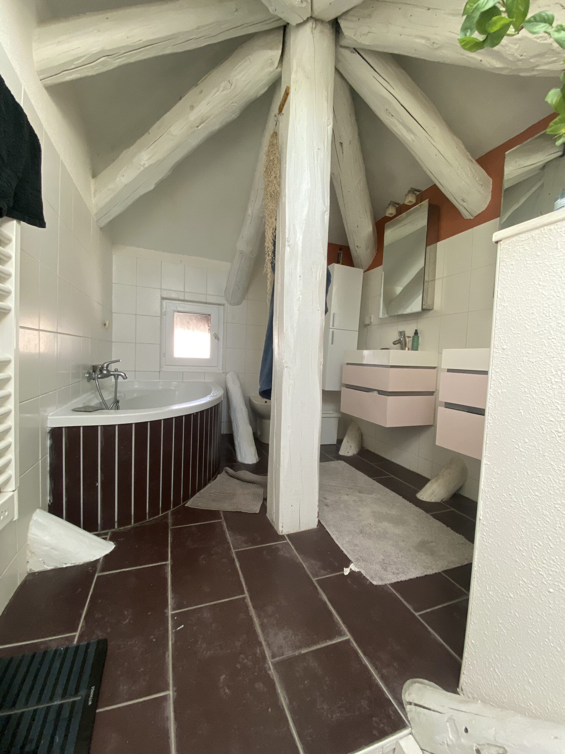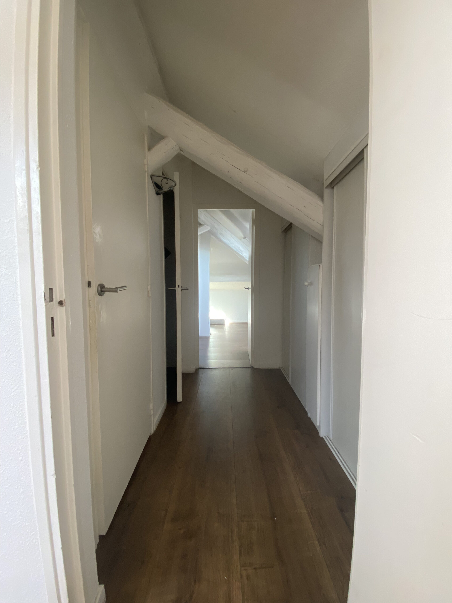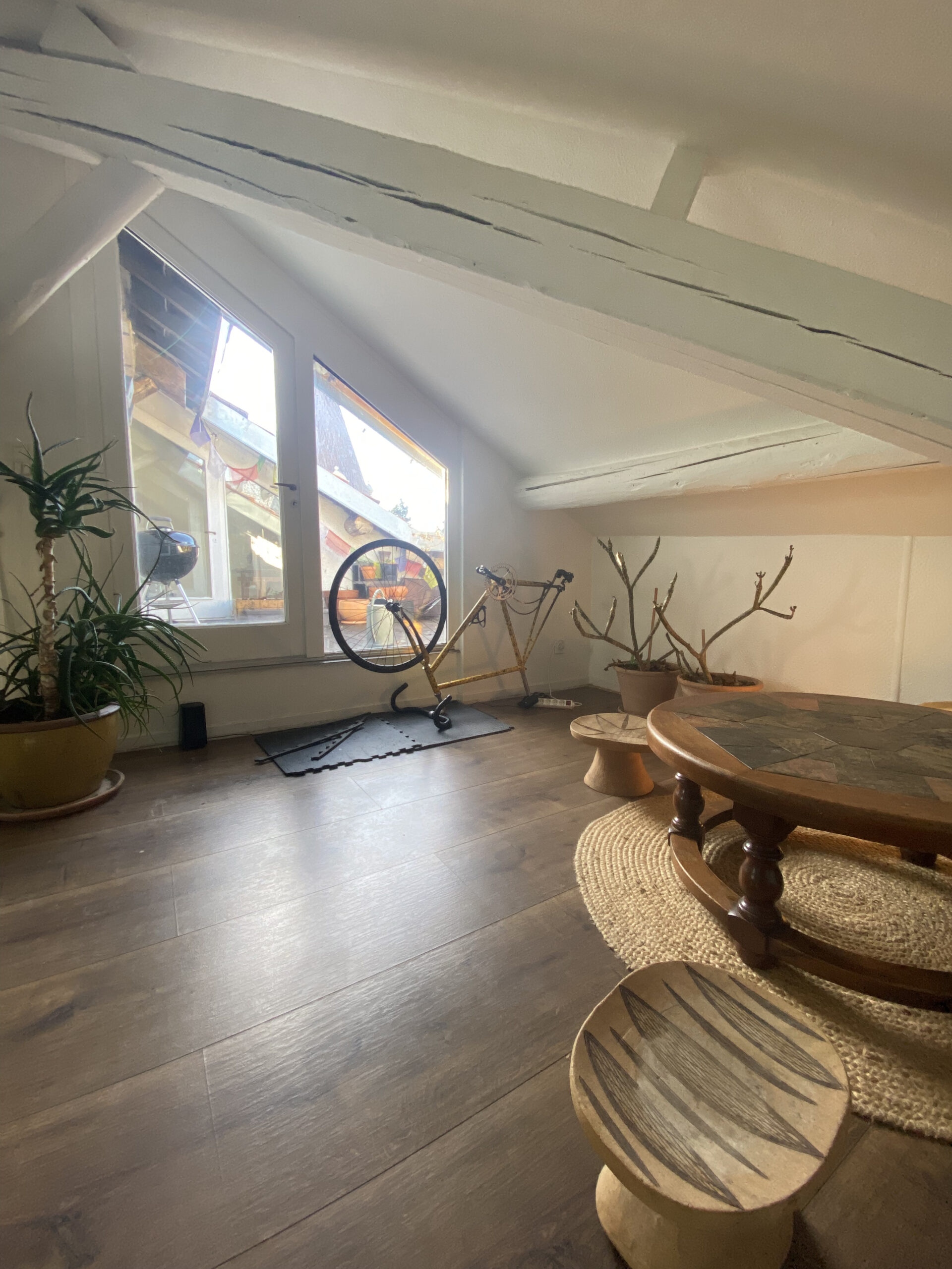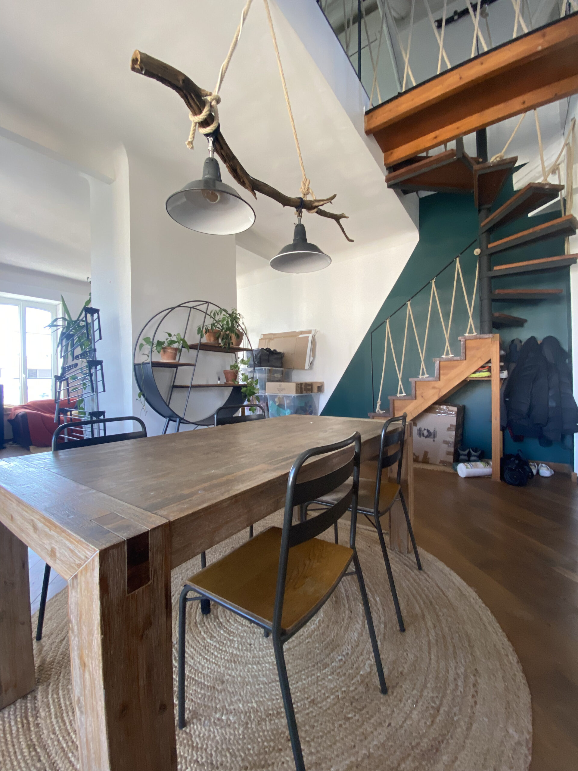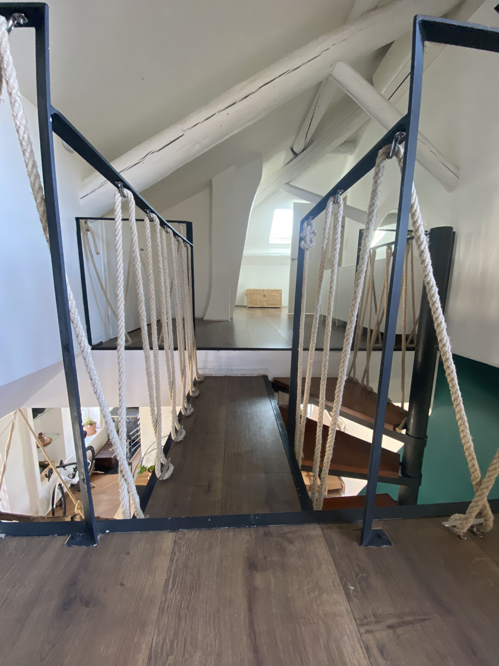L’appartement se compose au premier niveau d’un grand salon et d’une cuisine aménagée et entièrement équipée (un four, une hotte, des plaques de cuisson, un micro-ondes et une machine à laver, rangements et wc) et à l’étage, de deux chambres spacieuses d’une salle de bain avec baignoire d’angle, de WC séparés, de nombreux espaces pouvant être aménagés et d’une terrasse avec sur le parc de l’immeuble et sur les toits de la ville.